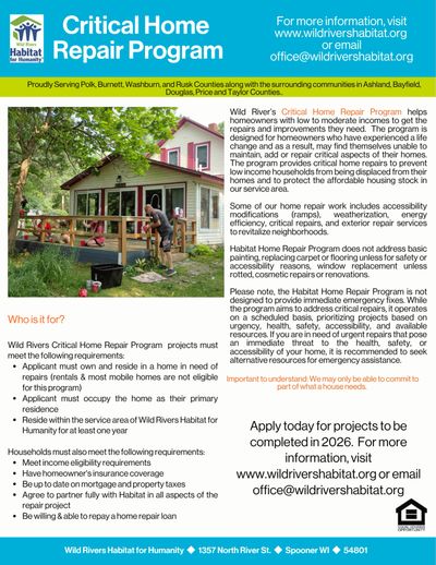 Please note, the Habitat Home Repair Program is not designed to provide immediate emergency fixes. While the program aims to address critical repairs, it operates on a scheduled basis, prioritizing projects based on urgency, health, safety, accessibility, and available resources. If you are in need of urgent repairs that pose an immediate threat to the health, safety, or accessibility of your home, it is recommended to seek alternative resources for emergency assistance.
