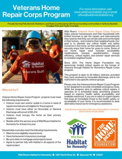 The Veterans Home Repair Corps Program helps income eligible veteran homeowners to get the repairs and improvements they need so that they can remain safe and comfortable in their homes - and rooted in their neighborhoods. Our goal is to alleviate any critical health and safety concerns in the home, so that veteran households can securely enjoy their home for years to come. Some of the home repair work includes accessibility modifications (ramps), weatherization, energy efficiency, critical repairs, and exterior repair services to revitalize neighborhoods. Since 2011, The Home Depot Foundation has generously funded critical repairs on the homes of veterans through Habitat for Humanity's Repair Corps program. This program is open to all military veterans, provided they have received an honorable discharge, and is not restricted to any specific veteran groups